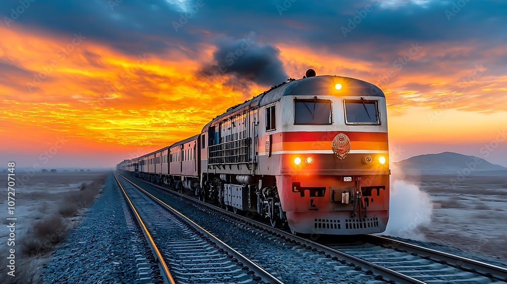 As the sun dips below the horizon, the sky transforms into a canvas of vibrant hues, casting a warm and ethereal light over the approaching Indian railway train #1072707148