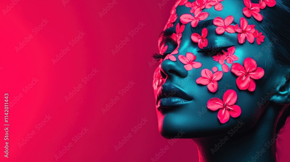 Aura Beauty glow luxury. Vibrant portrait of a woman with floral face art and colorful lighting. #1142011443