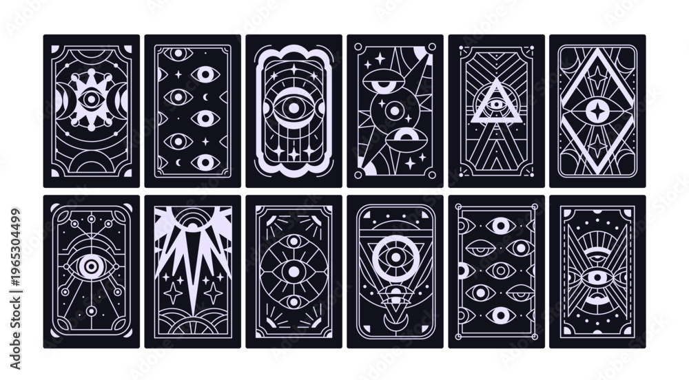 Back side of tarot cards set. Celestial cosmic occult symbols and signs, line geometric patterns, oracle eyes. Magic mystic esoteric taro posters, reverse background designs. Flat vector illustrations #1965304499