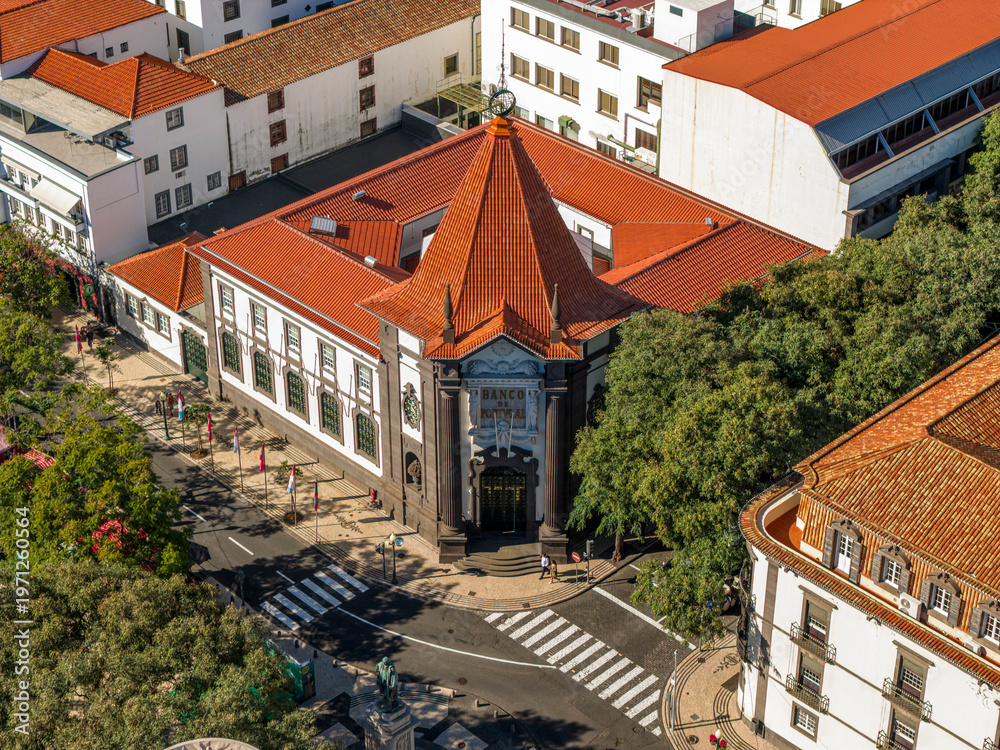Bank of Portugal, Funchal, Madeira, a historic building with elegant architecture and red tiled roof in the city center. #1971260564