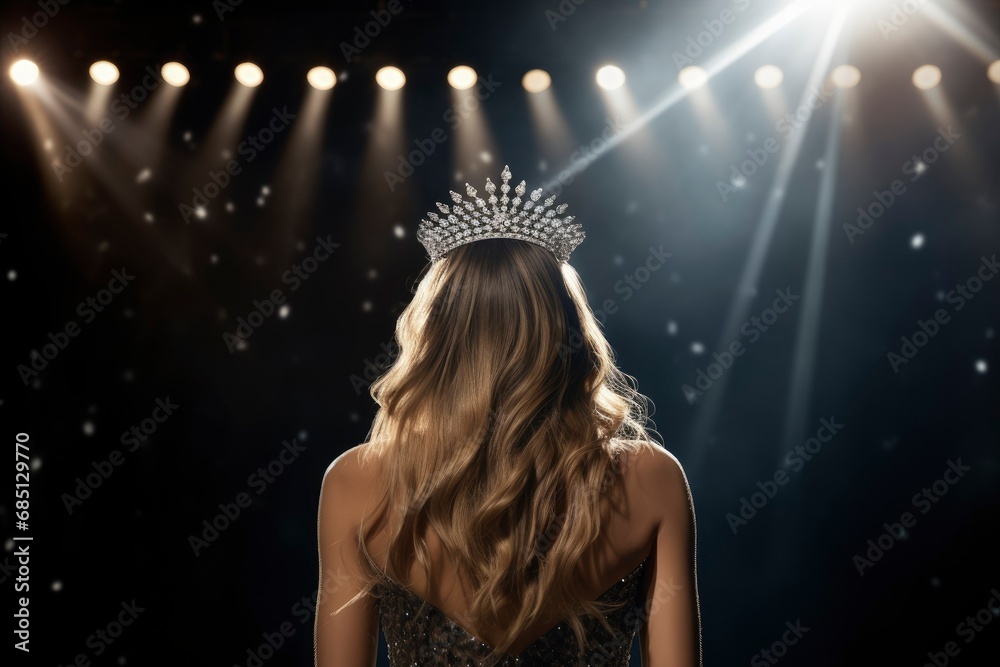 Beauty queen on the stage of a beauty pageant wearing a crown. Beauty queen wearing a tiara photo seen from behind #685129770