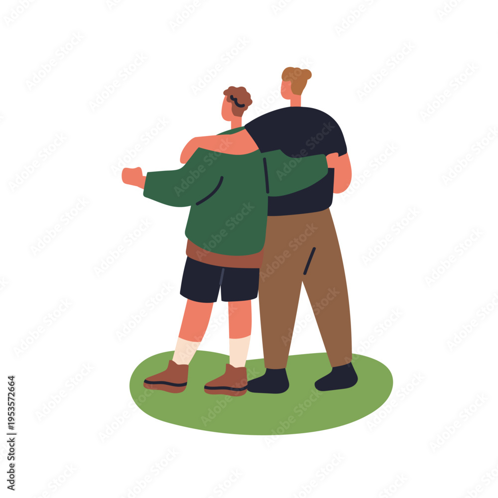 Best friends hugging, from behind. Male couple embracing, standing and looking together. Young men outdoors. Companionship and friendship. Flat vector illustration isolated on white background #1953572664