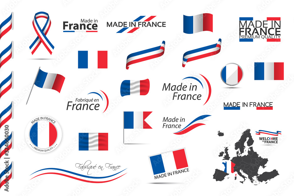 Big set of French ribbons, symbols, icons and flags isolated on a white background, Made in France, Welcome to France, premium quality, French tricolor, set for your infographics and templates #324660030