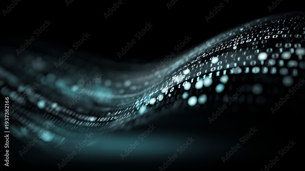 Binary code data wave abstract digital background flowing matrix line glowing particle stream dark cyber space futuristic technology motion blur neon light computer network blockchain concept #1937382166