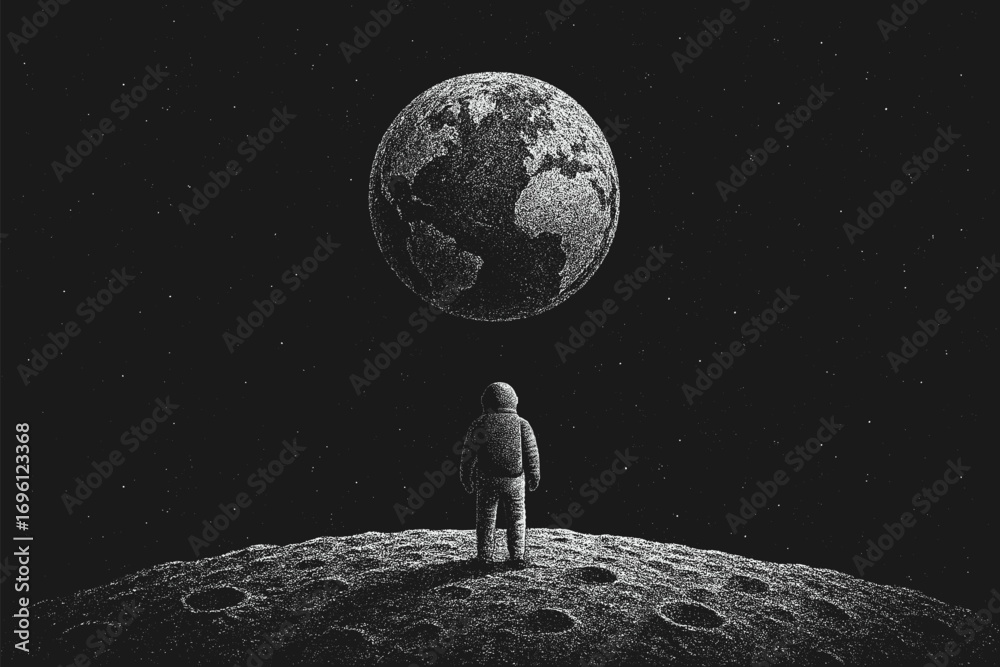 Black and white dotwork illustration of an astronaut standing on the Moon and looking at planet Earth. Hand-drawn stippling style, detailed engraving effect, monochrome space art #1696123368