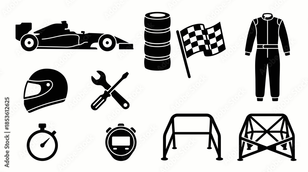 Black and white icons set for motor racing, including formula car, helmet, tools, and safety equipment, concept for motorsport event promotion, racing team branding and speed competition design #1853612625