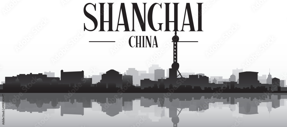 Black and white panoramic poster of the city skyline with misty background buildings and water reflection of SHANGHAI, CHINA #1918240640
