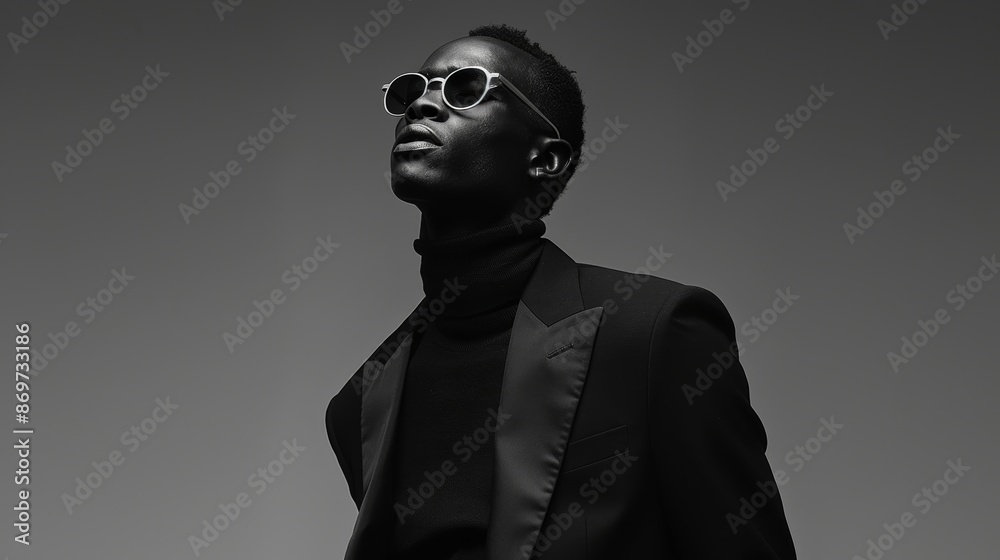 black man in black clothes on a monochrome background. Black and white photo - Portrait of a serious young afro american man dressed in all black on a minimalistic background #869733186