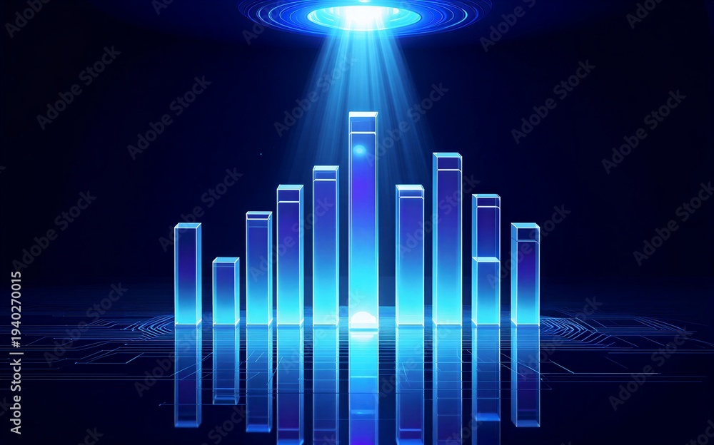 Blue bars glow under UFO light reflecting on digital grid floor. #1940270015