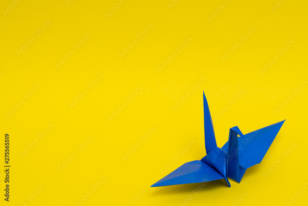 blue origami paper crane on yellow background #275565519