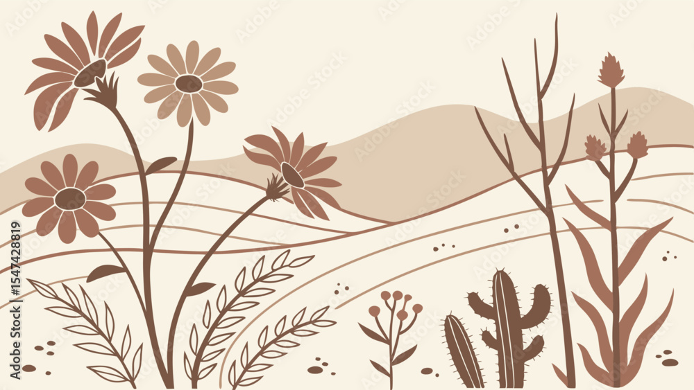 Boho desert landscape illustration featuring brown wildflowers, saguaro cactus, and arid plants in a serene, minimalist style with earthy beige tones. #1547428819