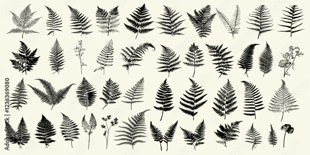 Botanical fern set illustrated in black and white, vintage vector design capturing the elegance of fern leaves with detailed, intricate linework in a timeless style #1236369080