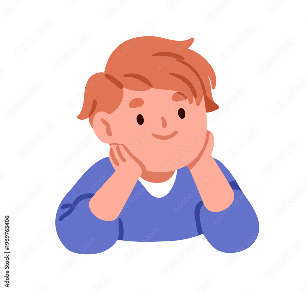 Boy kid leaning head on hands, listening with smiling cheerful interested face expression. Cute little preschool child. Adorable sweet character. Flat vector illustration isolated on white background #1969763406