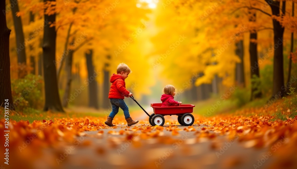 • #1267317124 Brother pulls sister in a wagon through an autumn park, covered in fallen leaves, under a canopy of golden trees and a bright sky.