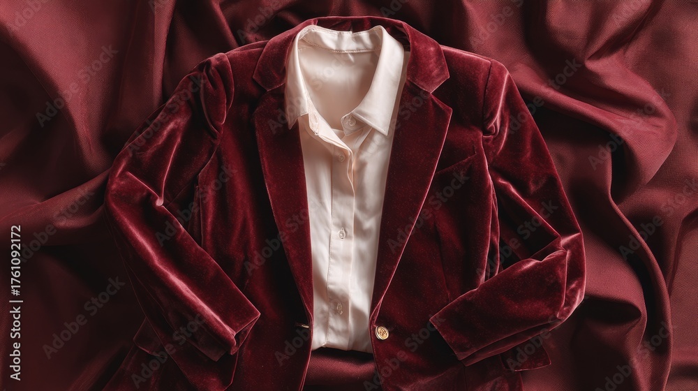 Burgundy velvet blazer flat lay mockup. Autumn fashion template #1761092172