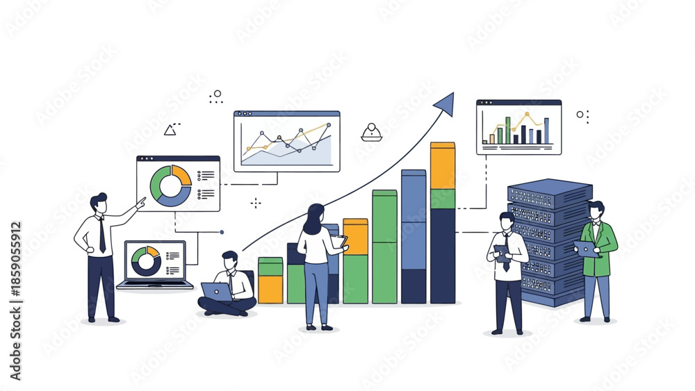 Business data analysis illustration featuring charts, graphs, and team members working collaboratively #1859055912
