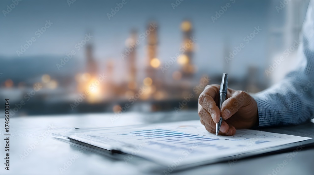 Business professional s hand analyzing growth charts industrial complex background #1745601884