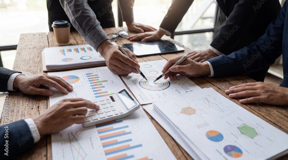 Business professionals collaborating around wooden table analyzing data with pens and calculator on transparent background #1893315153