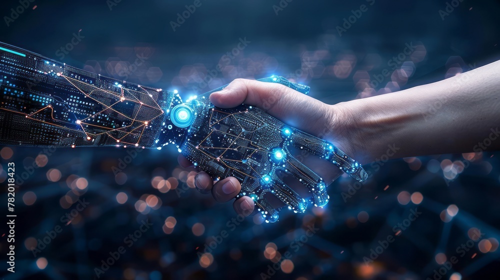 Businessperson shaking hand with digital partner over futuristic background. Artificial intelligence #782018423
