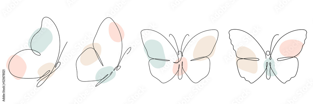 Butterfly continuous one line drawing set. Linear art butterfly flying with abstract pastel color shapes collection. Vector isolated on white. #521678021