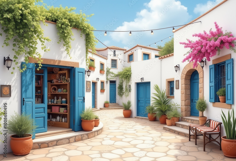 Calle de pueblo mediterráneo con casas blancas, puertas azules, macetas y decoración floral. #1008681495