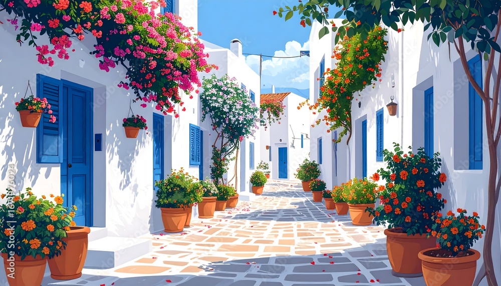 Calle griega mediterránea con casas blancas, puertas azules y macetas floridas #1671976024