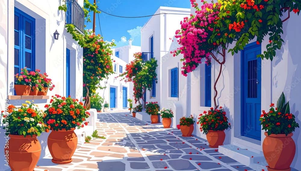 Calle mediterránea con casas blancas, puertas azules y buganvillas en flor #1671976196