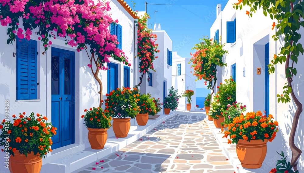 Calle mediterránea griega con casas blancas, puertas azules y macetas floridas al sol #1671975828