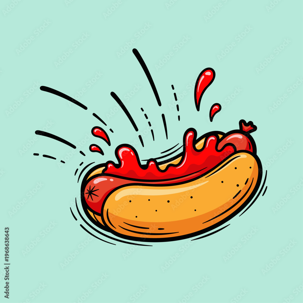 Cartoon hot dog with ketchup splashing. #1968638643