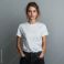 Casual woman in a plain white t-shirt standing against a gray background, perfect for apparel mockups and fashion designs with copy space. #926578598