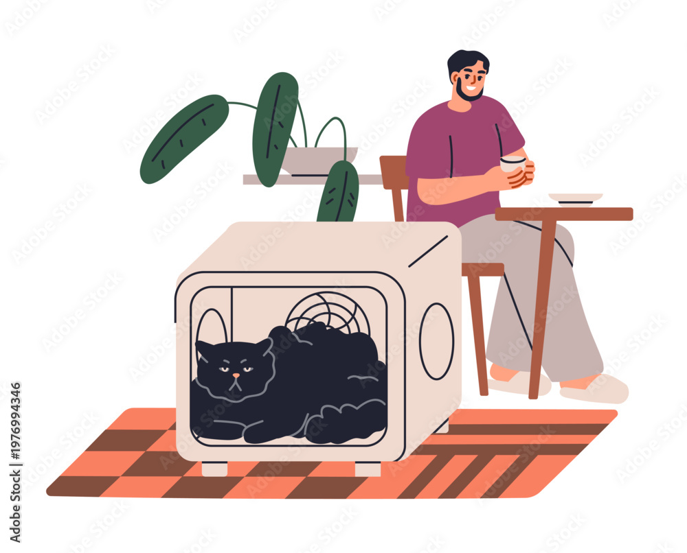 Cat lying inside drying box, automatic electric device for pet grooming. Feline animal in dryer after bath, washing. Fur hygiene, smart gadget. Flat vector illustration isolated on white background #1976994346