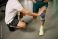 Caucasian young adult man assisting Caucasian young adult woman performing knee rehabilitation exercise in physical therapy setting, therapist supporting knee with brace during session #1890189999