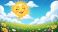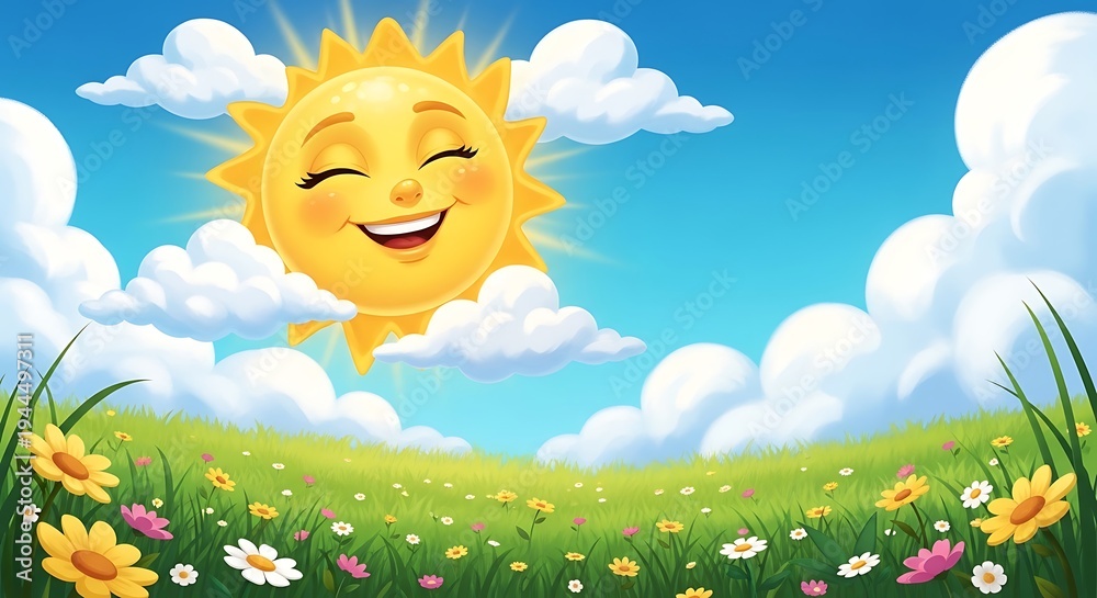 Cheerful cartoon sun smiling in a blue sky with fluffy clouds, over a vibrant meadow #1944497311