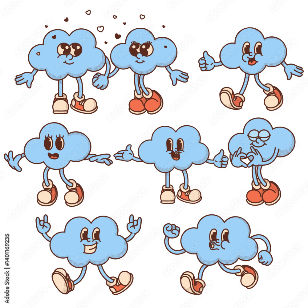 Cheerful cloud character retro mascot with smiling face, shoes, hands in rock gesture. Cute weather symbol #1401169235