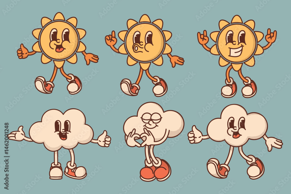 Cheerful sun and cloud character retro mascot with smiling face, shoes, hands in rock gesture. Cute spring or summer symbol #1462001248