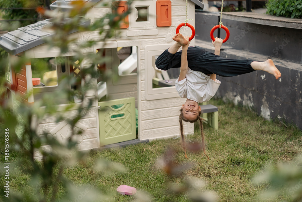 Child plays on gymnastic rings outside near a playhouse in a grassy yard #1881576386
