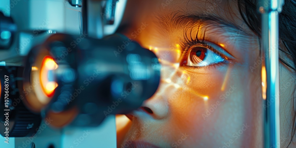 Child undergoing vision examination with an optometrist, focusing on eye sight testing, corrective lenses, and professional assessment #1070608767
