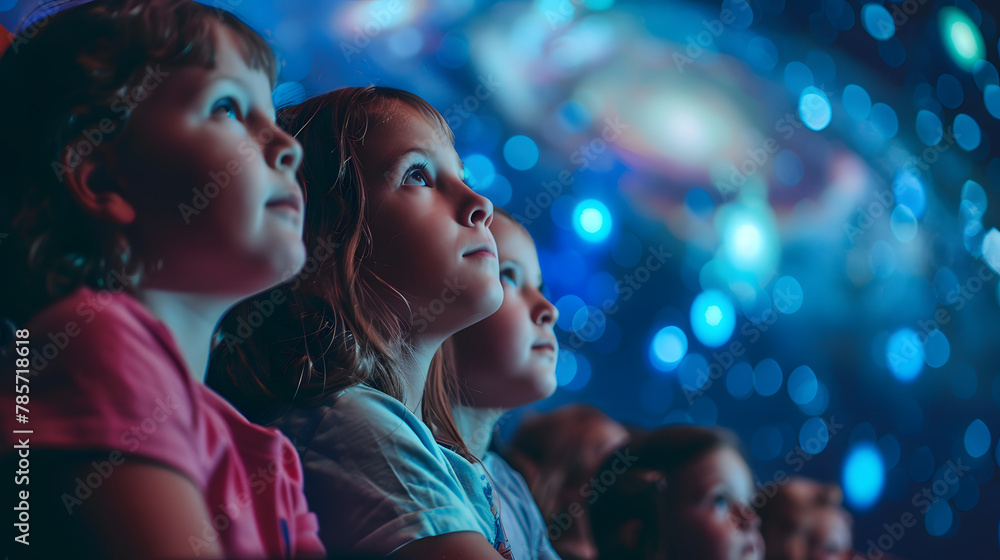 Children at a planetarium watching a show about galaxies absorbed in the experience. #785718618