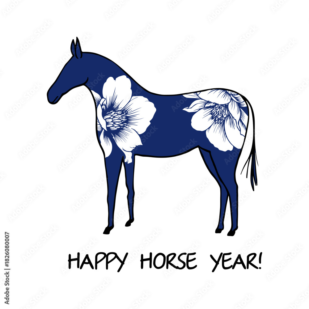 Chinese New Year Background. Happy New Year Card with Horse. Minimalist Drawing of Cute Horse with Flowers for Winter Holiday Design. #1826080007