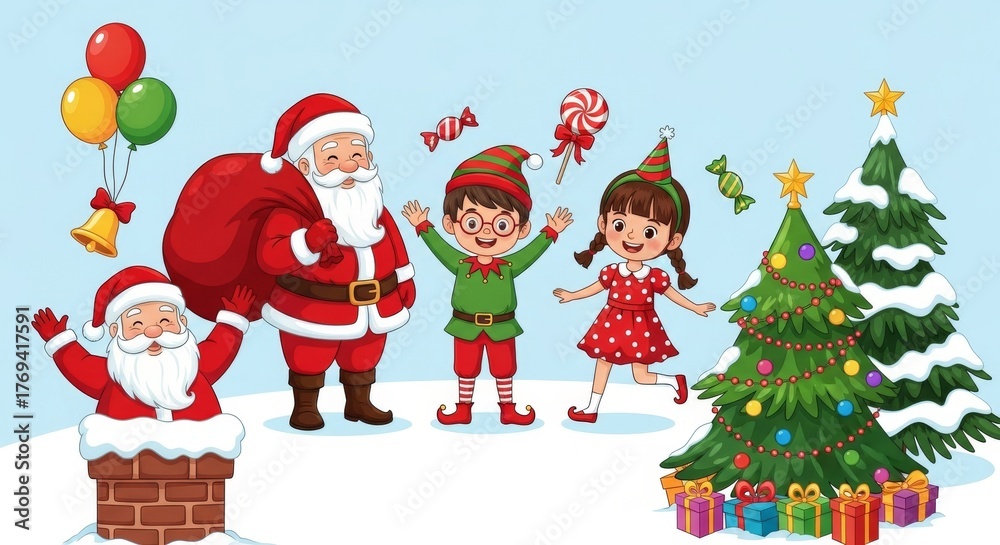 Christmas Celebration With Festive Characters - A vibrant cartoon illustration featuring Santa, elves, Christmas trees, and gifts. Festive and joyful! #1769417591