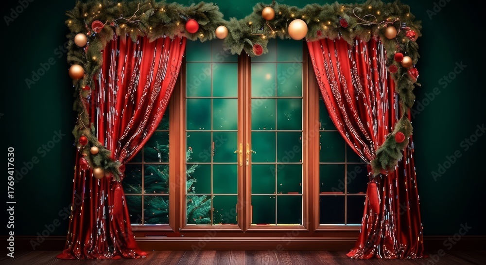 Christmas Window Decoration Scene - Festive holiday scene with a decorated window, curtains, and ornaments #1769417630