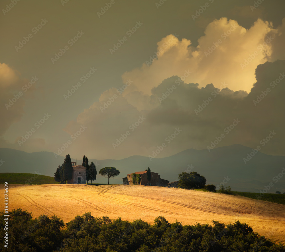 Cinematic Summer Landscape in Tuscany, Italy with Rolling Hills and Dramatic Sky #1943075629