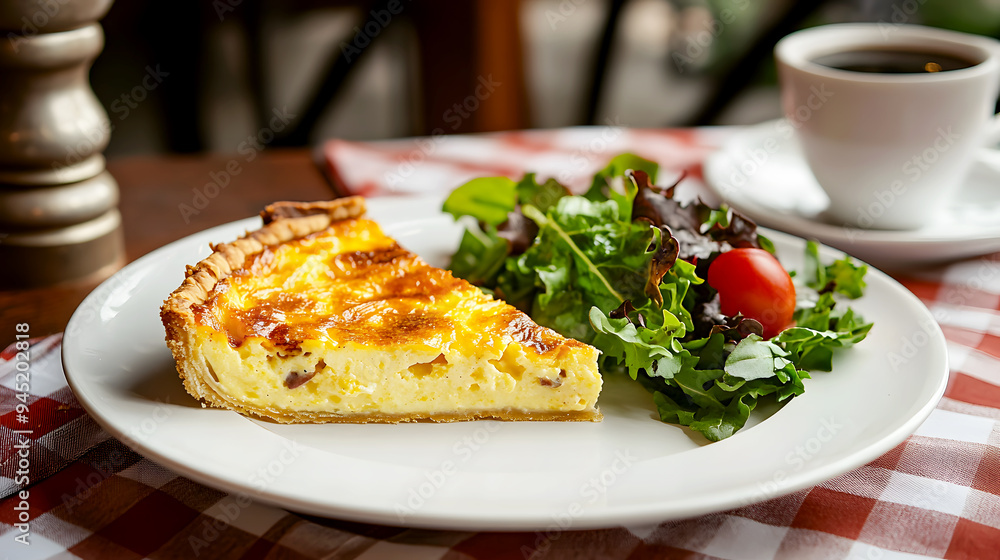 Classic French Bistro A slice of Quiche Lorraine served on a simple white plate with a side of mixed greens, set on a checkered tablecloth in a cozy French bistro #945202818