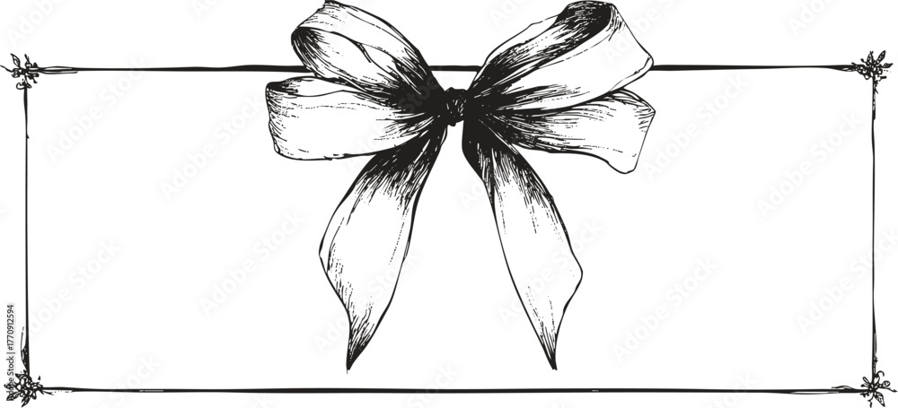 Classic pencil draw bow ribbon on rectangular frame, detailed line art illustration for holiday invitations, packaging, gift cards, festive designs. #1770912594