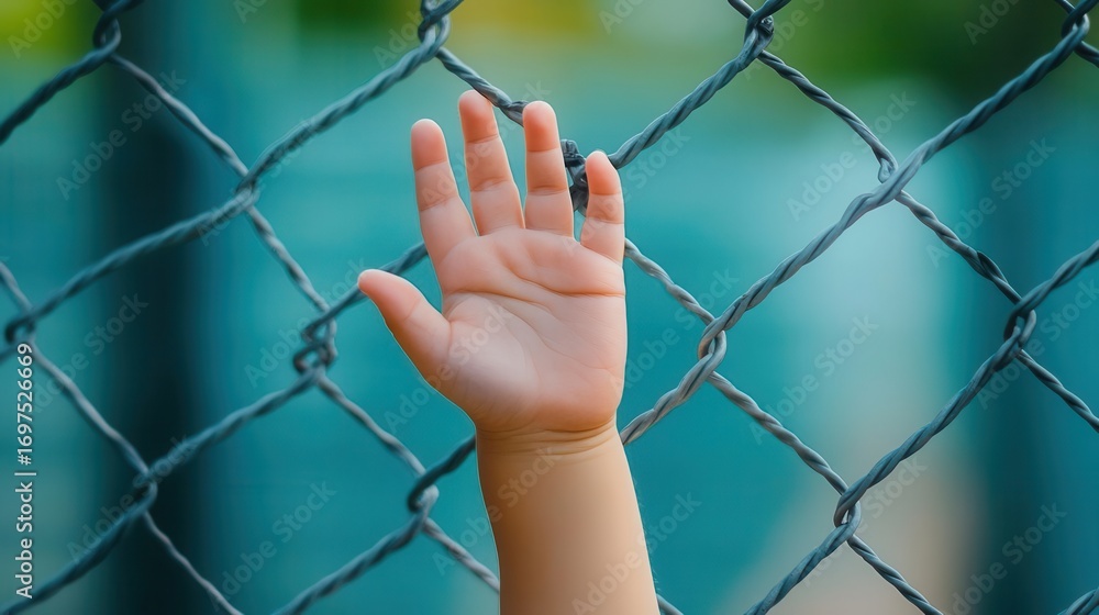 Close-up of a child's hand reaching out and gripping a chain-link fence with blurred outdoor background in vibrant lighting and detailed focus on fingers #1697526669