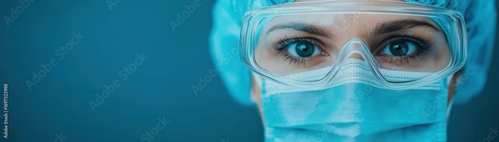 Close-up of a female healthcare professional wea protective glasses surgical mask and cap looking directly into the camera with focused eyes in medical environment #1697523988