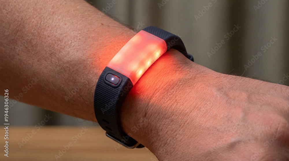 Close-up of an arm wearing a red light therapy wristband. The device emits a glowing red light for therapeutic purposes. Image made using Generative AI. #1946306326