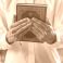 Close Up Of Man Hands Holding An Ornate Burgundy Quran Book With Gold Embossing In Natural Daylight Outdoor Setting #1920860610