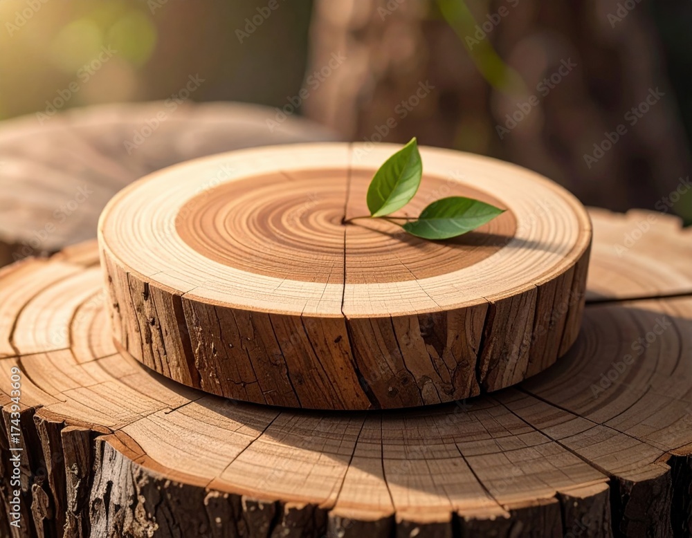 Close Up View Of Wooden Stump With Fresh Green Leaves In Sunlight Background With Brown Tones #1743943609