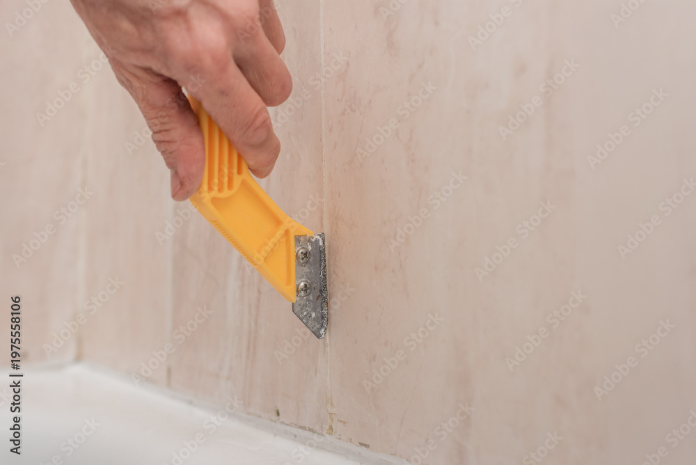 Closeup of male plumber removing old silicone in bathroom with special tool. Removing old grout between bathroom tiles with a special scraper #1975558106